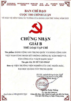 Trong không khí trang trọng của buổi lễ, GS.TS Từ Tần Pháp – Phó Chủ tịch danh dự Hội Triết học Việt Nam – vinh dự được trao Giải B với tác phẩm đăng trên báo, thuộc nhóm thể loại Tạp chí chuyên ngành với tên “Đảng Cộng sản Trung Quốc và Đảng Cộng sản Việt Nam đoàn kết phòng chống sự xâm nhập và tấn công của “cách mạng màu””. Tác phẩm của Giáo sư đã thể hiện tầm nhìn lý luận sâu sắc và lập luận chặt chẽ về sự cần thiết của việc củng cố khối đoàn kết quốc tế giữa hai Đảng Cộng sản Việt Nam và Trung Quốc trong bối cảnh tình hình thế giới diễn biến phức tạp, các thế lực thù địch không ngừng lợi dụng chiêu bài “dân chủ”, “nhân quyền” và “cách mạng màu” để can thiệp, gây bất ổn chính trị, xã hội ở nhiều quốc gia.